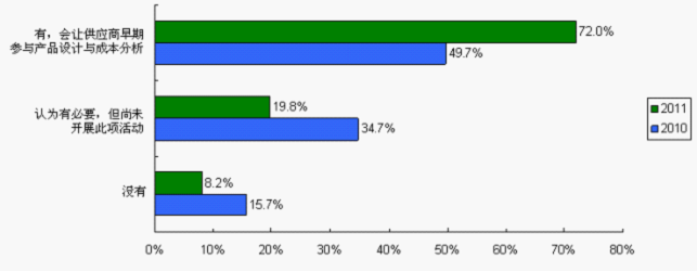 讓供應(yīng)商參與早期的產(chǎn)品設(shè)計(jì)是增進(jìn)供求雙方伙伴關(guān)系的途徑之一,借助供應(yīng)商的技術(shù)優(yōu)勢,挖掘元器件成本空間,從而提高產(chǎn)品競爭力、加快產(chǎn)品上市、降低成本。讓供應(yīng)商早期參與產(chǎn)品設(shè)計(jì)與成本分析由2010調(diào)查的49.7%大幅上升至2011調(diào)查的72%,而其中69.2%是主芯片供應(yīng)商的參與,30.8%是被動元件供應(yīng)商的參與。
