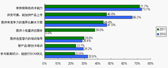 此外,工程師對成本降低持續(xù)關(guān)注,小批量供應(yīng)服務(wù)成為工程師關(guān)注的亮點(diǎn)。隨著市場的企穩(wěn),供貨可靠不再變成重大事件。2011中國電子制造商采購行為調(diào)查發(fā)現(xiàn),工程師對供貨穩(wěn)定可靠的期望由2010調(diào)查的66.2%大幅降至2011調(diào)查的46.8%。