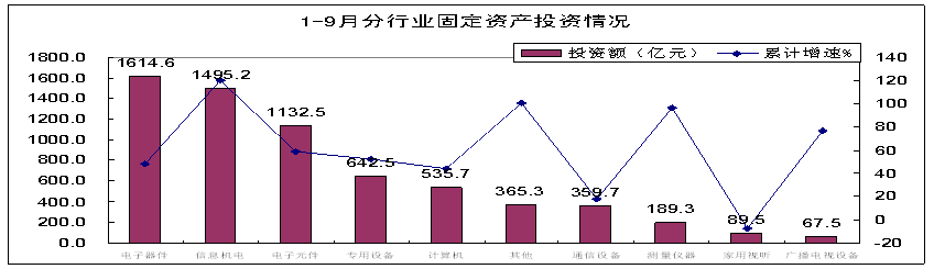 前三季度,電子信息產(chǎn)業(yè)500萬元以上項(xiàng)目完成固定資產(chǎn)投資6492億元,投資額超過去年全年水平近500億元,同比增長62.4%,增速高于工業(yè)投資35.9個(gè)百分點(diǎn)。其中9月份完成投資889.6億元,同比增長35.6%,增速比8月下降35.2個(gè)百分點(diǎn),這是今年以來第二個(gè)月月度投資增速低于60%。