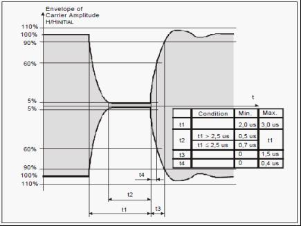 13.56MHz高頻RFID系統(tǒng)是目前國內(nèi)應(yīng)用最為廣泛,技術(shù)較為成熟的射頻識別系統(tǒng)。相關(guān)的國際標(biāo)準(zhǔn)對射頻發(fā)射頻率、信道帶寬、發(fā)射功率等參數(shù)都有明確的要求,特別是RF信號的幅度(功率)隨時(shí)間變化的情況,標(biāo)準(zhǔn)有著嚴(yán)格的規(guī)定。以讀寫設(shè)備為例,讀寫設(shè)備發(fā)出的載波信號的幅度變化時(shí)間,必須符合ISO18000-3標(biāo)準(zhǔn)對于t1-t4的時(shí)間限制。