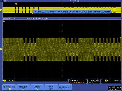 另一個(gè)需要嚴(yán)格保證的時(shí)間是從讀寫器發(fā)出讀卡信號后到標(biāo)簽返回信號的時(shí)間。過長或過短的時(shí)間都會被認(rèn)作讀寫失敗。使用傳統(tǒng)儀器測量這些信號的難度很大。MDO4000可以將RF信號的AvsT的軌跡完整展示的屏幕中,用戶只需用光標(biāo)定位到相應(yīng)位置,即可得到這一延遲時(shí)間。