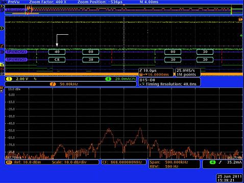 單片機(jī)芯片與讀寫控制芯片之間通過SPI總線通信。讀寫控制芯片的實(shí)際工作功能,通過更改內(nèi)部寄存器的數(shù)值加以管理。如:地址14的寄存器為codercontrol寄存器,控制編碼時(shí)鐘和模式。當(dāng)該寄存器的第三位至第五位的值為000時(shí),則編碼速率為848KB,當(dāng)數(shù)值為011時(shí),則為一個(gè)典型的ISO1443A編碼標(biāo)準(zhǔn),碼速率為106KB,數(shù)值為100時(shí)為ISO1443 TYPE B的編碼速率。這調(diào)試實(shí)戰(zhàn)中,如果我們發(fā)現(xiàn)頻譜副載波信號的頻率與我們設(shè)計(jì)的傳輸碼速率不一致時(shí),我們可以通過捕獲相應(yīng)地址的SPI總線數(shù)據(jù),查看相應(yīng)的寄存器的數(shù)值,確定出現(xiàn)此類問題的原因。Codercontrol寄存器的0-2位,控制的是傳輸數(shù)據(jù)的編碼形式。如果在設(shè)計(jì)調(diào)試中發(fā)現(xiàn)有數(shù)據(jù)通信不能建立的問題,可以檢查這三位的數(shù)值,核查實(shí)際的編碼形式是否正確。“000”代表ISO14443-B的NRZ非歸零編碼,“001”表示ISO14443A的Miller編碼,而“110”和“111”則表示ISO15693標(biāo)準(zhǔn)對應(yīng)的編碼形式。