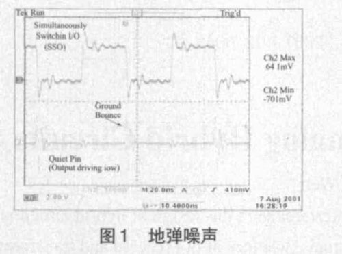 模擬信號(hào)與數(shù)字信號(hào)相比,對(duì)噪聲的敏感程度要大得多,因?yàn)槟M電路的工作依賴連續(xù)變化的電流和電壓,任何微小的干擾都能影響它的正常工作,而數(shù)字電路的工作依賴在接收端根據(jù)預(yù)先定義的電壓電平或門限對(duì)高電平或低電平的檢測(cè),具有一定的抗干擾能力。但在混合信號(hào)環(huán)境中,數(shù)字信號(hào)相對(duì)模擬信號(hào)而言是一種噪聲源。數(shù)字電路工作時(shí),穩(wěn)定的有效電壓只有高低電平兩種電壓。當(dāng)數(shù)字邏輯輸出由高電壓變?yōu)榈碗妷海撈骷慕拥毓苣_就會(huì)放電,產(chǎn)生開(kāi)關(guān)電流,這就是電路的開(kāi)關(guān)動(dòng)作。數(shù)字電路的速度越快,其開(kāi)關(guān)時(shí)間一般也要求越短,當(dāng)大量的開(kāi)關(guān)電路同時(shí)由邏輯高電平變?yōu)檫壿嫷碗娖綍r(shí),由于地線通過(guò)電流的能力不夠,大量的開(kāi)關(guān)電流就會(huì)引起邏輯地電壓發(fā)生波動(dòng),我們稱為地彈。如圖1 所示。數(shù)字電路造成的地彈噪聲和電源擾動(dòng),如果耦合到模擬電路中,就會(huì)影響模擬電路的工作性能。由于相當(dāng)多的干擾源是通過(guò)電源和地總線產(chǎn)生的,其中地線引起的噪聲干擾最大,所以在PCB 設(shè)計(jì)時(shí)對(duì)地和電源的設(shè)計(jì)就顯得尤為重要。