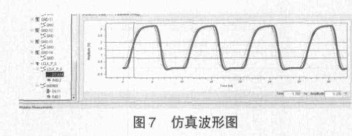 此印制板上100M 的時(shí)鐘信號(hào)線經(jīng)過(guò)設(shè)計(jì)軟件仿真分析,如圖7 所示,信號(hào)傳輸基本沒(méi)有受到干擾,達(dá)到電訊要求。生產(chǎn)的印制板經(jīng)過(guò)調(diào)試顯示,數(shù)字信號(hào)對(duì)模擬信號(hào)的干擾很小,參數(shù)指標(biāo)良好。