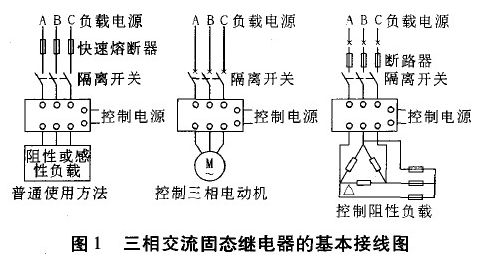 單相SSR為四端有源器件,其中兩個(gè)輸入控制端,兩個(gè)輸出端,輸入輸出間為光隔離,輸入端加上直流或脈沖信號(hào)到一定電流值后,輸出端就能從斷態(tài)轉(zhuǎn)變成通態(tài)。而三相交流固態(tài)繼電器則是集三只單相交流固態(tài)繼電器為一體,并以單一輸入端對(duì)三相負(fù)載進(jìn)行直接開(kāi)關(guān)切換,可方便地控制l一相交流電機(jī)、加熱器等三相負(fù)載,圖1為三相交流固態(tài)繼電器的基本接線(xiàn)圖。三相交流固態(tài)繼電器的相與相問(wèn),輸入輸出間,以及與基板之間絕緣電壓大于2 000 VAC,其他基本指標(biāo)與相應(yīng)的單相固態(tài)繼電器相同。需要指出的是對(duì)實(shí)際負(fù)載電流不大的場(chǎng)合,比如實(shí)驗(yàn)室教學(xué),三相SSR使用起來(lái)比較方便,但電流大時(shí)發(fā)熱亦大,這時(shí)使用三只單相SSR更為可靠。