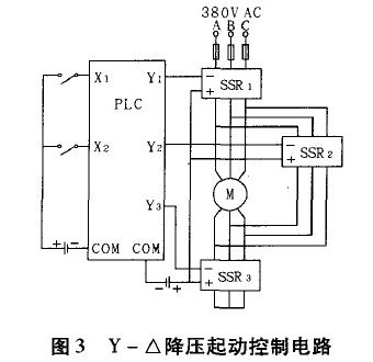 圖3為PLC控制的Y-△降壓起動(dòng)控制電路,其中X1、X2分別表示PLC的輸入,控制電動(dòng)機(jī)的起停;Y1、Y2、Y3表示PLC的輸出。當(dāng)Y1和Y3有效時(shí),對(duì)應(yīng)的SSR1和SSR3也同時(shí)有效,此時(shí)電動(dòng)機(jī)為Y型接法,延時(shí)幾秒后,Y3失效,Y2有效,則對(duì)應(yīng)的SSR3三相輸出端斷開(kāi),SSR2三相輸出端合上,則電動(dòng)機(jī)變?yōu)椤鹘臃ǎ瓿闪薡一△降壓起動(dòng)。