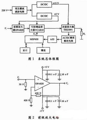 系統(tǒng)組成框圖如圖1所示。系統(tǒng)主要由4個部分構(gòu)成:前置放大電路、可控增益放大電路、后級功率放大電路和單片機顯示控制模塊。第一級用OPA820ID構(gòu)成的放大電路增益為6 dB,實現(xiàn)了輸入阻抗匹配;可控增益放大電路由VCA810組成,實現(xiàn)了-40~+40 dB的動態(tài)增益變化;后級放大電路增益為14 dB;單片機顯示控制模塊完成對VCA810的控制以及輸出電壓檢測功能并用液晶顯示輸出電壓的峰峰值和有效值。