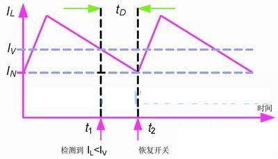一般而言,通常采用比較器來檢測IL是否超出IV,以決定關斷或重新開通??墒?比較器會帶來延時tD,影響閾值的有效值。如圖2所示,比較器在t1時刻檢測到IL< p> V,可是偶遇延時tD,開關會在t2時刻被恢復。基于這個原因,有效閥值IN便會低于IV,這樣,實際的輸出IOUT(CL)為: