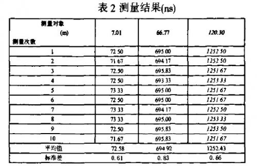 由關(guān)系式(2)可知,對已知材料的電纜,電纜長度L與發(fā)射脈沖與反射脈沖間時(shí)間間隔Δt成正比。通過對已知長度的電纜發(fā)射脈沖與反射脈沖的時(shí)間間隔進(jìn)行測量,可以對時(shí)間間隔測量模塊的特性進(jìn)行驗(yàn)證。本文對長7.01m,66.77m和120.30m的電纜分別進(jìn)行多次測量,測量結(jié)果如表2所示。