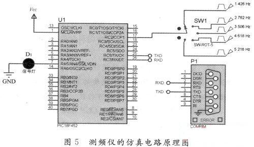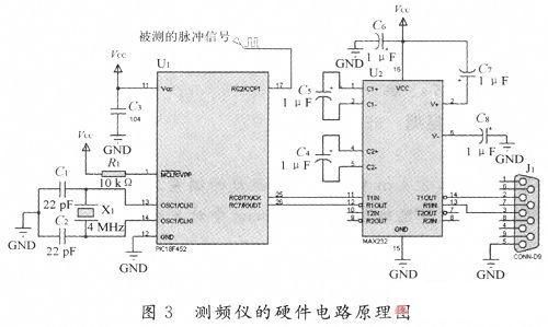 測(cè)頻儀的硬件電路主要包括兩個(gè)方面:頻率測(cè)量電路和數(shù)據(jù)通信電路。頻率測(cè)量是指使用PIC18F452的CCP模塊測(cè)量外部脈沖信號(hào)的頻率;數(shù)據(jù)通信是指將測(cè)量得到的數(shù)據(jù)通過(guò)串口傳至PC機(jī)進(jìn)行處理。測(cè)頻儀的硬件電路如圖3所示。