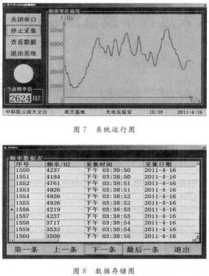 仿真通過(guò)之后,就可以按照?qǐng)D3搭建硬件電路來(lái)進(jìn)行硬件的運(yùn)行測(cè)試。在此使用VB 6.0來(lái)編寫(xiě)上位機(jī)軟件,同時(shí)配合Access數(shù)據(jù)庫(kù)來(lái)存儲(chǔ)PIC18F452上傳的頻率數(shù)據(jù)。系統(tǒng)的運(yùn)行效果如圖7,圖8所示。
