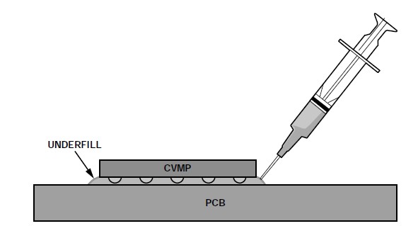 焊接完成后,由于焊料厚度有限,封裝與PCB之間會有一個較窄的空間。已經(jīng)證明,用底部填充材料填充此空間可以改善焊接抗疲勞壽命,因為它能減輕這種封裝(引腳為嵌入式,不能用來釋放應力)中焊點應力的影響。