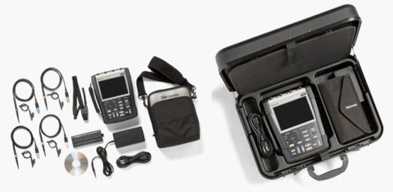 手持示波器經(jīng)常用于進(jìn)行電機(jī)驅(qū)動器、功率變換器/逆變器和功率半導(dǎo)體器件的功率測量。通過結(jié)合使用泰克的廣泛電壓和電流探頭,THS3000系列手持示波器可進(jìn)行這些測量。其四個輸入通道中的每個通道均可進(jìn)行配置,以匹配探頭類型和衰減系數(shù),確保正確的測量和光標(biāo)讀數(shù)。該產(chǎn)品標(biāo)配4個新型的 300 MHz CAT III 安全等級探頭,也標(biāo)配了OpenChoice軟件,像以前使用泰克臺式示波器一樣方便。圖4中左圖為THS3000系列標(biāo)準(zhǔn)機(jī)型配件,包括 4 個探頭、電池、電源適配器和電源線、OpenChoice CD、校準(zhǔn)證書、系帶和軟提箱。圖4中右圖為TK 機(jī)型配件,包括4 個探頭、電池、電池適配器和電源線、 OpenChoice CD、校準(zhǔn)證書、系帶、探頭配件包、探頭盒和硬提箱。