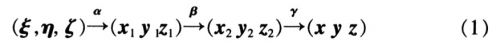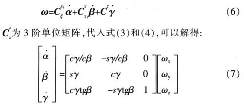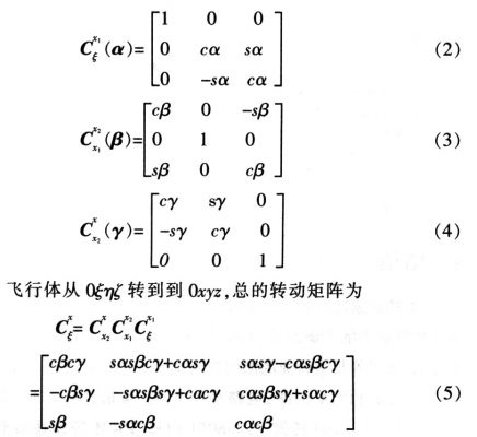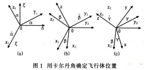 在對剛體的轉(zhuǎn)動運動進行解析描述時.常應用歐拉角或卡爾丹角??柕そ沁m用于姿態(tài)角變化較小的場合,因此.用卡爾丹角進行描述。取初始時刻飛行體坐標系Oξηζ為固定坐標系,0xyz為與飛行體固結(jié)的動坐標系??柕そ沁x取的方法是,首先繞ξ軸轉(zhuǎn)過α角,到達0x1y1zl的位置;再繞y1軸轉(zhuǎn)動β角,到達0x2y2z2的位置;再繞z2軸轉(zhuǎn)動γ角,到達0xyz的位置。轉(zhuǎn)動關(guān)系如圖l所示。