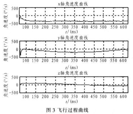 存儲測試系統(tǒng)已經(jīng)成功應用于某小型飛行體的試驗,成功獲得了測試數(shù)據(jù)。下面是實測曲線及其分析,x軸為自轉(zhuǎn)軸,z軸為飛行方向。實測飛行過程角速度信號如圖3所示,圖3中,3個軸的角速度曲線在70 ms處均有一個小鼓包,為陀螺的加速度效應在曲線上的表現(xiàn)。