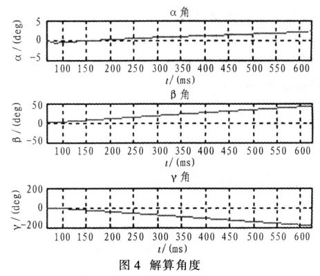 陀螺儀測得的ωx、ωy以及ωz已知,根據(jù)表達式7所示的運動學微分方程,在MATLAB下解算出角度,如圖4所示。經(jīng)對比,與高速攝影記錄的姿態(tài)非常吻合。