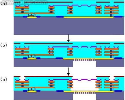 下圖簡述了Post-CMOS MEMS的制造方式。在Post-CMOS MEMS工藝中需特別注意,不能讓額外的熱處理或高溫工藝影響到CMOS組件的物理特性及MEMS的應(yīng)力狀態(tài),以免影響到振膜的初始應(yīng)力。鑫創(chuàng)科技公司克服了諸多的技術(shù)難題,完全采用標(biāo)準(zhǔn)的CMOS工藝來同時制造電路元件及微機電麥克風(fēng)結(jié)構(gòu)。在CMOS部分完成后,將芯片的背面研磨至適當(dāng)厚度以符合封裝要求。最后,利用氫氟酸溶液(HF)去除犧牲氧化物來釋放懸浮結(jié)構(gòu)。此外,在設(shè)計中還需考慮可完全去除犧牲材料而又不損害麥克風(fēng)振膜的蝕刻方法,并應(yīng)避免麥克風(fēng)振膜與背電極板之間產(chǎn)生粘黏現(xiàn)象。