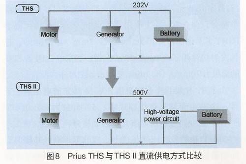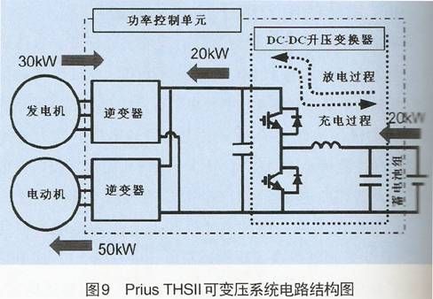 在THS中,蓄電池通過逆變器直接與電機和發(fā)電機相連(見圖8);而THSⅡ中,蓄電池組輸出的電壓首先通過DC—DC升壓變換器進行升壓操作,然后再與逆變器相連,因此逆變器的直流母線電壓從原THS的220V提升為現(xiàn)在的500V。