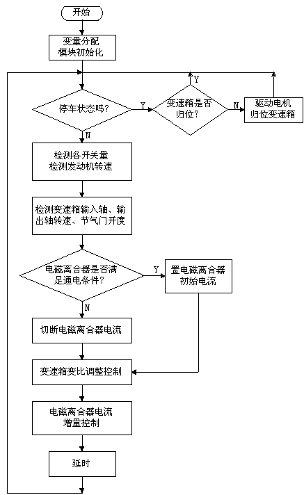 TCU控制系統(tǒng)主程序框圖如圖3所示。程序首先對內(nèi)部RAM進行分配,然后對各功能模塊如Administrator/D轉(zhuǎn)換器、定時器、PWM波形發(fā)生器等進行初始化。變速箱的變比在汽車每次時應(yīng)處于最小變比的位置,因此在每次停車時應(yīng)將變速箱歸位,汽車起動后首先檢測各參數(shù),如檔位開關(guān)、發(fā)動機轉(zhuǎn)速、節(jié)氣門開度、變速箱輸入、輸出軸轉(zhuǎn)速等。這些參數(shù)是控制電磁離合器電流和電動機狀態(tài)的依據(jù)。當需要增加變速箱的變比時,TCU控制電機正轉(zhuǎn),反之控制電機反轉(zhuǎn)。電磁離合器的控制采用電流增量控制方式。它的控制好壞,直接影響汽車運行的平穩(wěn)性和經(jīng)濟性。