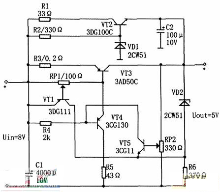 當(dāng)輸出電壓增大時,三極管VT5基極偏壓減小,其集電極電流減小,電壓升高,從而引起三極管VT4基極電壓升高,電流減小,其發(fā)射極(即調(diào)整管VT3基極)電壓升高,電流減小,VT3管壓降Uce3增大,這樣就使輸出電壓降低,達(dá)到穩(wěn)壓的目的。輸出電壓可以通過調(diào)節(jié)電位器RP2加以改變。