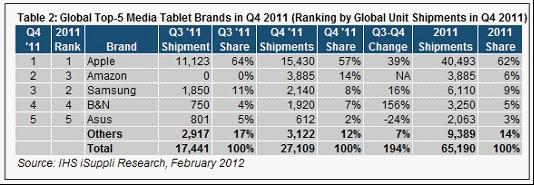 2011年全年,蘋果iPad出貨量為4050萬個,比2010年的1510萬個大增168%。去年蘋果的市場份額為62.0%,低于2010年的87%。在2010年的大部分時(shí)間里,蘋果獨(dú)占媒體平板市場。