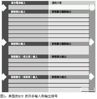 ECU 利用許多信號(hào)來(lái)監(jiān)控汽車及其環(huán)境,進(jìn)而管理與控制引擎和輔助設(shè)備,以達(dá)到最佳的運(yùn)作狀態(tài)。圖1摘要了典型的ECU 的許多輸入和輸出信號(hào)?! ?br />