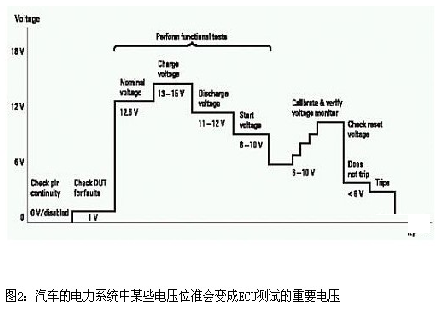 依汽車的操作狀態(tài)而定,在汽車的電力系統(tǒng)中常會(huì)碰到某些電壓位準(zhǔn)。這些位準(zhǔn)會(huì)變成ECU測(cè)試的重要電壓,如圖2所示。在這些重要電壓下執(zhí)行的一些相關(guān)測(cè)試包括: