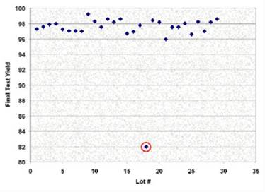 圖4最終測試良率(超負(fù)載試驗(yàn)前)和標(biāo)出不符合統(tǒng)計(jì)良率限值的點(diǎn)的示例圖。該點(diǎn)是一個(gè)異常值,是要求進(jìn)一步篩選和分析的風(fēng)險(xiǎn)點(diǎn),也可能會出現(xiàn)不合格品?! ?/p>
