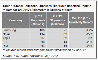 據(jù)IHS iSuppli公司的DRAM市場簡報,爾必達第一季度營業(yè)收入比2011年第四季度增長1%,占據(jù)大約12.6%的市場份額,排名升至第三。雖然其增長幅度可能顯得很小,但爾必達的表現(xiàn)優(yōu)于整體DRAM市場。第一季度整體DRAM市場的營業(yè)收入為62億美元,比2011年第四季度的65億美元下降4%,如表1所示。爾必達的表現(xiàn)也優(yōu)于緊隨其后的美光。美光的第一季度營業(yè)收入環(huán)比下降3%,排名下降一位至第四。
