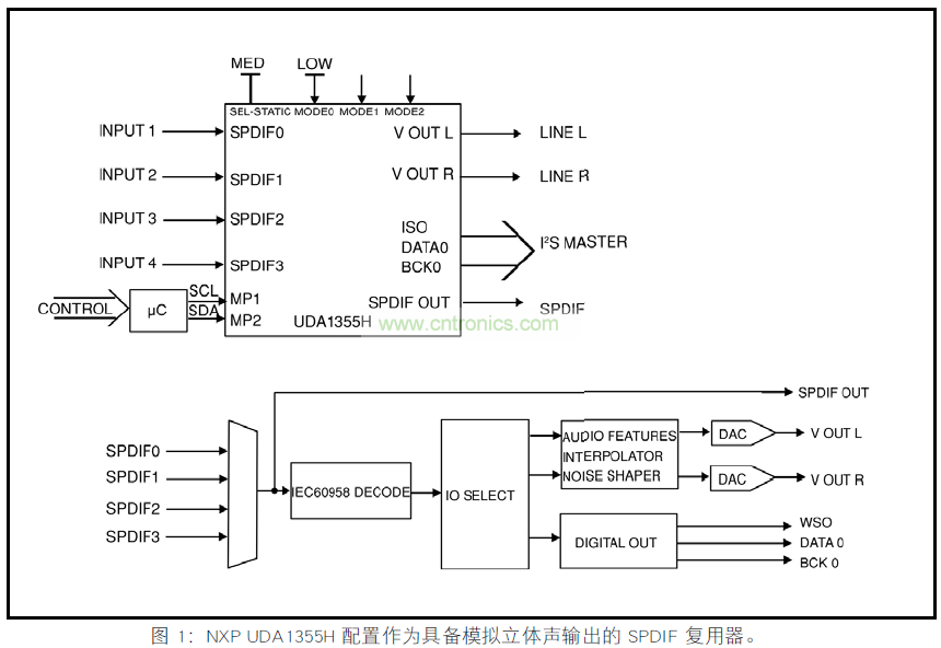 圖 1 顯示了配置為 1/4 SPDIF 的多路復用器,有模擬立體聲輸出的 NXP UDA1355H。請注意,復用器中選擇的SPDIF 信號也可以傳輸?shù)?SPDIF 輸出,使組件可以使用菊花鏈,保持數(shù)字域音頻,維持音頻質(zhì)量。因此,可以很容易地實現(xiàn) 1/(3n+1)多路復用器,其中第 n 個DAC,I2S 或 SPDIF 作為主復用輸出。如果這是所需要的全部,通過簡單將 SEL_STATIC引腳設置為高( 靜態(tài)模式),而不是中(I2C 模式),僅使用 UDA1355H無須微控制器就可以實現(xiàn)。
