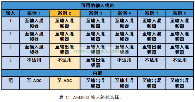 WM8960 提供了全面的內(nèi)部路由選項,表 1 顯示了路由輸入有多么靈活。案例 2 描述了圖 4 所示的信號路徑路由。
