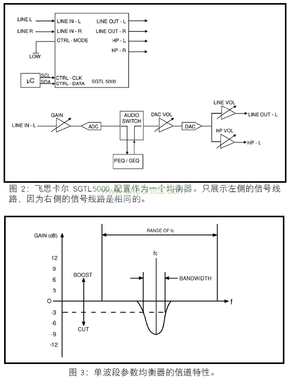 來自飛思卡爾半導體的 SGTL5000 編解碼器,提供了增強音頻功能的不同選擇。圖 2 顯示了使用設備均衡塊的應用,可以作為音調(diào)控制器,七波段參數(shù)均衡器或五波段圖形均衡器。