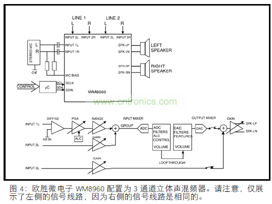 其它功能包括主音量,自動音量控制,環(huán)繞立體聲和低音增強。SGTL5000 還提供了一個集成的耳機放大器。第三個設備,來自歐勝微電子的 WM8960,是目前編解碼器中高水平集成技術的代表。此部分顯示在圖 4 中,已配置為立體聲麥克風和兩個立體聲線路級源的立體聲混頻器,帶有直接(D 類)揚聲器驅(qū)動器。它還包括一個片載耳機驅(qū)動器,連接 16Ω 負載,功率可達 40mW。