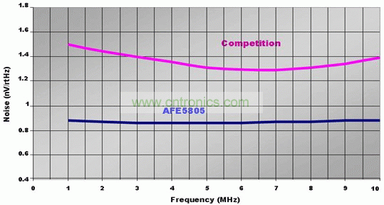 為了滿(mǎn)足上述標(biāo)準(zhǔn),我們需要一個(gè)超聲波 AFE(例如 TI 的 AFE5805)。最為先進(jìn)的 BiCMOS 和 CMOS 技術(shù)用于對(duì)功耗和噪聲性能進(jìn)行優(yōu)化。由于其低功耗、小芯片尺寸以及較低的閃爍噪聲, BiCMOS 工藝是 AFE5805 VCA 部分的理想之選。CMOS 工藝非常適用于模數(shù)轉(zhuǎn)換器。與同類(lèi)解決方案相比,這些綜合的創(chuàng)新使尺寸縮小了 50%,功耗降低了 20%,噪聲減少了 40%。圖 2 所示的恒 定噪聲性能涵蓋了整個(gè)工作頻率范圍。因此,我們?cè)O(shè)計(jì)的便攜式超聲波系統(tǒng),可以實(shí)現(xiàn)卓越的圖像質(zhì)量以及最低的功耗。