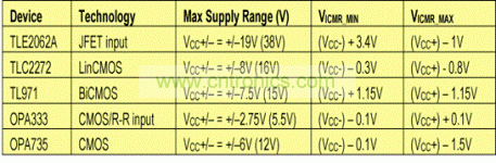 值得一提的一種寬輸入范圍特例是“軌到軌輸入運(yùn)算放大器”。盡管,顧名思義,它是一種輸入涵蓋整個(gè)電源軌范圍的運(yùn)算放大器,但并非所有軌到軌輸入器件都如許多人設(shè)想的那樣涵蓋整個(gè)電源范圍。許多軌到軌輸入運(yùn)算放大器的確涵蓋了整個(gè)電源范圍(例如:表1中的OPA333等),但有一些則沒有全覆蓋,而其描述對(duì)人具有一定的誤導(dǎo)性。另外,檢查產(chǎn)品說明書中的規(guī)定輸入范圍至關(guān)重要。