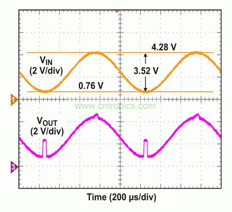 VIN稍稍增加至3.52 Vp-p,VOUT便開始在正(5V)和負(fù)(0V)軌附近呈現(xiàn)非線性行為(圖5)。VIN進(jìn)一步增加至4.2 Vp-p,明顯超出VICMR。由于輸入峰值在正軌附近超出限制,因此其上跳至正軌(5V),并在VIN返回到某個(gè)可接受范圍以前一直保持在該狀態(tài),最終VOUT信號(hào)出軌(圖6)。隨著輸入降至負(fù)軌附近限制以下,VOUT信號(hào)表現(xiàn)出倒相,同時(shí)其跳至中軌(2.5V),并在VIN增加到VICMR范圍內(nèi)某個(gè)可接受電壓水平以前,一直通過偏壓來跟隨VIN。