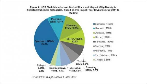 根據(jù)IHS iSuppli公司在三個(gè)季度內(nèi)拆解分析的55個(gè)嵌入產(chǎn)品,這些產(chǎn)品中有三分之一以上的NOR芯片屬于美國(guó)Spansion Inc.,在所有供應(yīng)商中處于領(lǐng)先地位,如圖所示。Spansion,以及韓國(guó)三星電子和美國(guó)美光,提供的NOR芯片平均密度為數(shù)百M(fèi)b。從2011年第三季度到今年第二季度,這三家公司占上述三個(gè)子領(lǐng)域中NOR芯片的53.4%。剩下的46.6%市場(chǎng)份額屬于生產(chǎn)100Mb以下密度NOR閃存的廠商。這類廠商包括臺(tái)灣旺宏電子和華邦電子等大型廠商,以及臺(tái)灣常憶科技和宜揚(yáng)科技等規(guī)模較小的廠商。