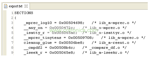 在主程序的Linker flags 加上-Wl,--mgen-symbol-ld-script=export.txt ,ld 會產(chǎn)生export.txt這個檔案, 這個檔案包含了一個SECTION block以及許多變數(shù)的地址。如下圖所示