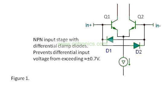 許多運(yùn)算放大器都在輸入端之間有電壓鉗位,其大多數(shù)一般都使用背靠背二極管(有時使用兩個或者更多的串聯(lián)二極管)來實(shí)施。這些二極管保護(hù)輸入晶體管免受其基極結(jié)點(diǎn)反向擊穿的損害。差動輸入為約6V 時便會出現(xiàn)許多IC 工藝擊穿,這會極大地改變或者損壞晶體管。下圖顯示了NPN 輸入級,D1 和D2 提供了這種保護(hù)功能。