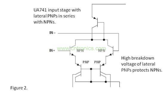 一般而言,雙極NPN 晶體管運(yùn)算放大器都有輸入鉗位,例如:OP07、OPA227 和OPA277 等。uA741 是一個例外,它具有NPN 輸入晶體管,并且有一些為NPN 提供固有保護(hù)的附加串聯(lián)橫向PNP。