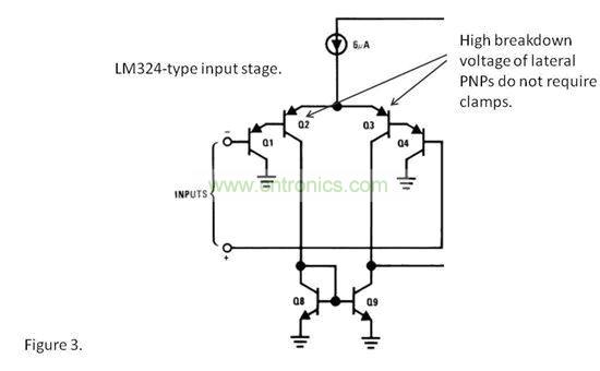使用橫向PNP 輸入晶體管的通用運(yùn)算放大器一般沒有輸入鉗位,例如:LM324" target="_blank" title="Link to Product Folder">LM324、LM358" target="_blank" title="Link to Product Folder">LM358、OPA234" target="_blank" title="Link to Product Folder">OPA234、OPA2251" target="_blank" title="Link to Product Folder">OPA2251 和OPA244" target="_blank" title="Link to Product Folder">OPA244。這些運(yùn)算放大器一般為“單電源”類型,其意味著它們擁有一個擴(kuò)展至負(fù)電源端(或者稍低)的共模范圍。輸入偏置電流為一個負(fù)數(shù)時,表示輸入偏置電流自輸入引腳流出。這時,我們通??梢哉J(rèn)定它們?yōu)檫@類運(yùn)算放大器。但是,需要注意的是,使用PNP 輸入的高速運(yùn)算放大器一般有輸入鉗位,而這些PNP 是一些具有更低擊穿電壓的垂直PNP。