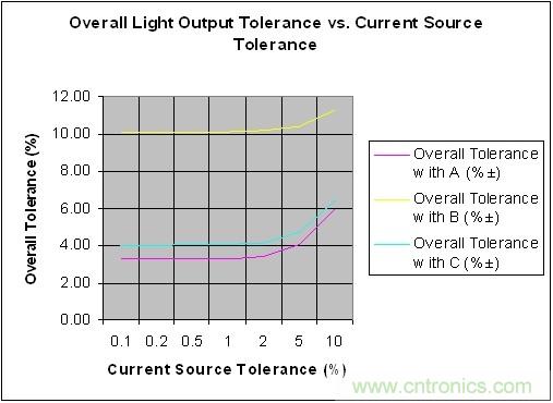表2和圖3給出了整體容差和一列假設(shè)電流源容差的對比情況,此時假設(shè)LED光輸出在350mA的區(qū)域內(nèi)隨前向電流呈線性變化。