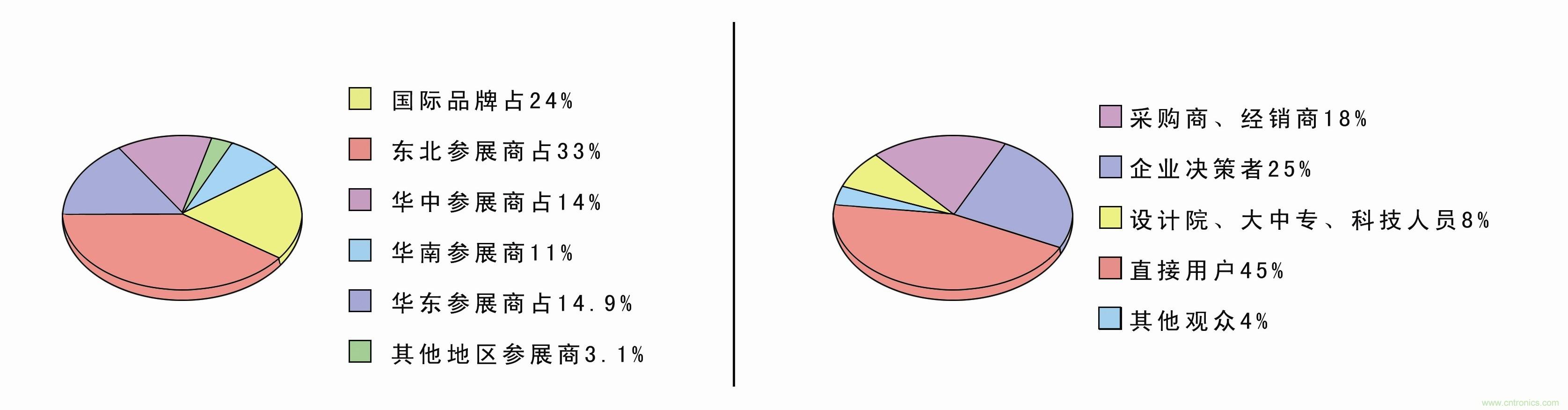 上屆展會(huì)于2012年5月16-18日在大連星海會(huì)展中心舉行,展會(huì)規(guī)模已達(dá)一萬(wàn)多平方米,四百多個(gè)展位。世界知名的廠商:西門子、ABB、施耐德、三菱電機(jī)、奧托尼克斯、歐姆龍、LG、艾默生、寶帝、威圖、米思米、町洋機(jī)電、匯川等企業(yè)齊聚一堂,美國(guó)、日本、韓國(guó)等國(guó)外展團(tuán)的大量參與,使展會(huì)更具吸引力;展會(huì)的觀眾主要來(lái)自東北、華北、華東、華中、西北、臺(tái)灣、香港及日本、韓國(guó)、俄羅斯等地,其主要為相關(guān)行業(yè)的決策人士、技術(shù)人員及采購(gòu)負(fù)責(zé)人。本屆展會(huì)為切合您的需求,直接面向?qū)I(yè)買家、進(jìn)出口商、分銷商、代理商和直接用戶,為您締造更多的商機(jī)!此次展會(huì)有參展商三百多家,參觀商兩萬(wàn)余人,其中各占比例如下: