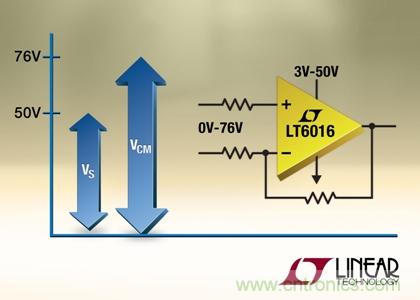 Over-the-Top 輸入提供了遠(yuǎn)超過(guò) V+ 軌的真正工作。LT6016 / LT6017 在輸入比V– 高出多達(dá) 76V 時(shí)仍能正常工作,而不受 V+ 是 3V 還是 50V 的影響。其他容錯(cuò)功能保護(hù)運(yùn)算放大器免受電源反向情況 (在 V– 高達(dá) -50V)、負(fù)的瞬態(tài) (在 VIN 高達(dá) -25V) 以及無(wú)供電時(shí)強(qiáng)制輸出電壓 (在 VOUT 高達(dá) 50V) 的影響。這種堅(jiān)固的架構(gòu)對(duì)某些應(yīng)用情況尤其有用,例如放大器位于與另一電路板的模擬接口,以及對(duì)高壓側(cè)和低壓側(cè)電流檢測(cè)的應(yīng)用。