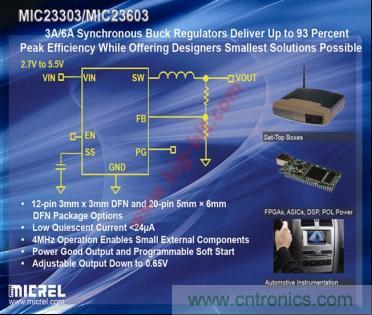 麥瑞半導(dǎo)體推出了采用HyperLight(R)Load技術(shù)的4MHz PWM 6A/3A同步降壓穩(wěn)壓器系列產(chǎn)品MIC23603/303。MIC23603/303采用的專(zhuān)利架構(gòu)提供了最高水準(zhǔn)的瞬態(tài)性能,在全脈寬調(diào)制(PWM)模式下輸出紋波僅有5mV。MIC23603/303將低損耗的專(zhuān)利功率MOSFET與麥瑞半導(dǎo)體擁有專(zhuān)利的恒定導(dǎo)通時(shí)間直流-直流開(kāi)關(guān)轉(zhuǎn)換器方案結(jié)合在一起,可提供高達(dá)6A/3A的輸出電流,同時(shí)僅消耗24μA靜態(tài)電流。MIC23603/303是驅(qū)動(dòng)機(jī)頂盒、便攜式設(shè)備以及汽車(chē)儀表中的FPGA、ASIC和DSP集成電路的理想產(chǎn)品,在這些應(yīng)用中,超快瞬態(tài)響應(yīng)和輕載效率至關(guān)重要。MIC23603目前已經(jīng)開(kāi)始批量供應(yīng),千片訂量的價(jià)格為1.08美元/片。MIC23603的千片訂量?jī)r(jià)格為0.49美元/片。