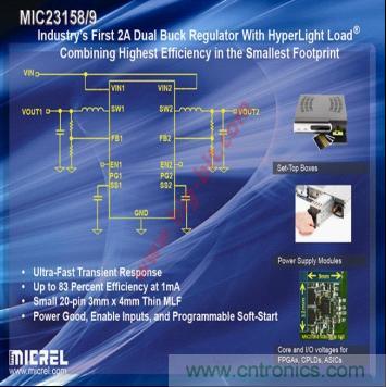 麥瑞半導(dǎo)體推出了兩款3MHz雙輸出2A高效降壓穩(wěn)壓器MIC23158/9。得益于麥瑞半導(dǎo)體擁有專(zhuān)利的HyperLight Load®技術(shù),這兩款集成電路為當(dāng)今最苛刻的應(yīng)用提供了超快的瞬態(tài)響應(yīng),包括機(jī)頂盒、針對(duì)FPGA的核心和I/O電壓、CPLD、ASIC、GPS/導(dǎo)航系統(tǒng)、PC卡、汽車(chē)儀表以及通用負(fù)載點(diǎn)(POL)直流-直流轉(zhuǎn)換等應(yīng)用。MIC23158/9目前已經(jīng)開(kāi)始批量供應(yīng),千片訂量的價(jià)格分別為0.88美元/片和0.91美元/片。