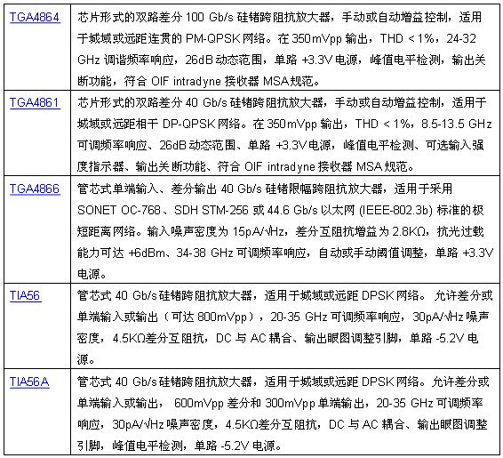 TriQuint新的跨阻抗放大器TGA4864、TGA4861、TGA4866、TIA56和TIA56A提供了許多片上 (on-chip) 的優(yōu)勢(shì);現(xiàn)已供應(yīng)樣品。