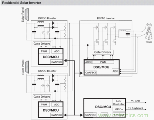 家庭太陽能逆變系統(tǒng)中,飛思卡爾的處理器、微控制器產(chǎn)品,如MC56F84XXX、MC56F82XX、56F803X等等產(chǎn)品,為整個系統(tǒng)帶來可行、高效、可靠的電源轉(zhuǎn)換方案。