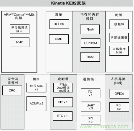 以Kinetis子系列KE02 MCU為例來看。KE02 MCU以ARM Cortex-M0+為內(nèi)核,該內(nèi)核以其低功耗特性深獲市場贊譽。KE02也是Kinetis E系列的入門級產(chǎn)品,引腳與整個E系列兼容,擴展靈活,另外,它們還與8位S08P系列兼容。