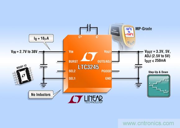 凌力爾特推出通用型 250mA 高電壓降壓-升壓型充電泵 LTC3245 的新型高可靠性 MP 級、較寬溫度范圍版本。MP 等級器件具有 -55°C 至 +150°C 的工作結(jié)溫范圍。LTC3245 采用開關(guān)電容器分數(shù)轉(zhuǎn)換,以在 2.7V 至 38V 的寬輸入電壓范圍內(nèi)保持調(diào)節(jié)作用,并產(chǎn)生一個 3.3V、5V 或可調(diào) (2.5V 至 5V) 的穩(wěn)壓輸出。內(nèi)部電路自動地選擇 2:1、1:1 或 1:2 的轉(zhuǎn)換率,以在輸入電壓和負載條件變化時優(yōu)化效率。低工作電流 (無負載時為 18μA,停機時為 4μA) 和很少的外部器件數(shù)目 (3 個小型陶瓷電容器,無電感器) 使 LTC3245 非常適用于低功率和空間受限的汽車應(yīng)用 (例如 ECU / CAN 收發(fā)器電源)、工業(yè)內(nèi)務(wù)處理電源、以及高效的低功耗 12V 至 5V 轉(zhuǎn)換。